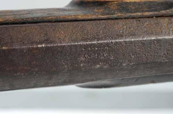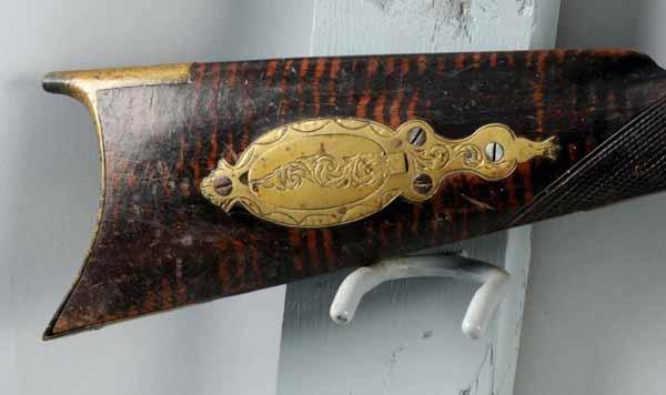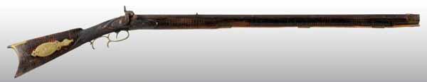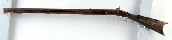Description Circa 1840 to 1850. OL: 49 - 1/4". BL: 34". TB: Octagonal. LM: Percussion. PB: Oval. S: Curly Maple. SR: Two patched areas. Incise carving. This later Kentucky rifle is unsigned but "Lancaster, PA" is still visible on the barrel with its artificially-grained maple stock being intact with the exception of two small patches on both sides of the upper forestock. The oval patchbox and trigger guard are nicely engraved. Condition (Good).