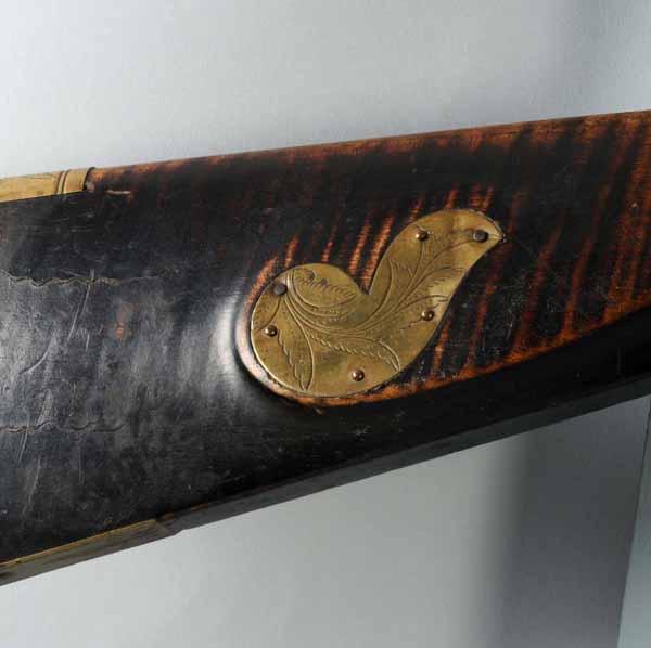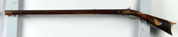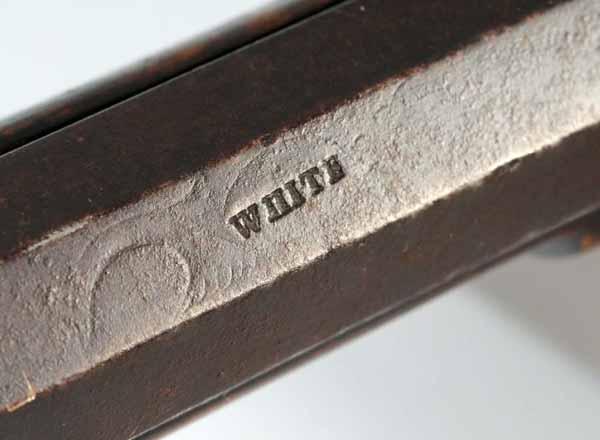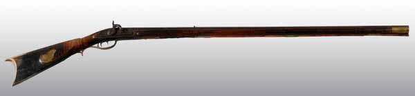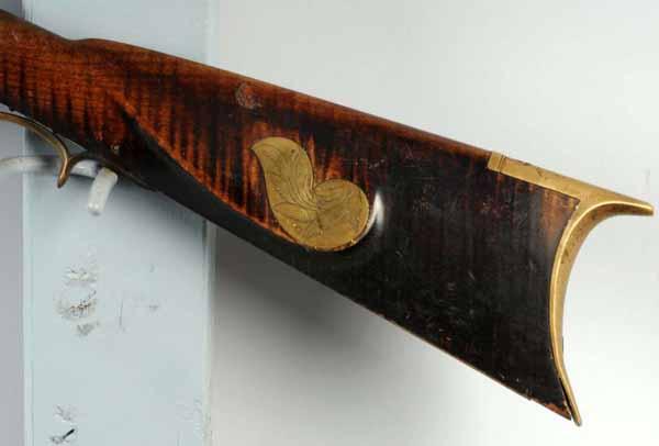 Description Circa 1840 to 1860. OL: 54 - 1/2”. BL: 39”. TB: Octagonal. LM: Percussion. Replaced. PB: None. S: Curly Maple. Three brass inlays. This signed “White” may be a very late Peter White or a related family member. The uniqueness of this rifle is the fact that is has curved cheekpieces on both dies of the buttstock with an inlaid floral engraved brass inlay. All of the brass mountings are very finely engraved including the trigger guard and the nose-cap. The very fine curly maple stock with its original surface is still intact with just a 3/8-inch sliver of wood missing from the front of the rear ramrod ferrule to the nose-cap. Otherwise, the stock is sound. Condition (Good).