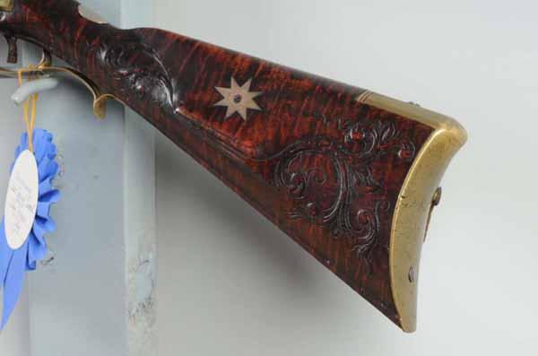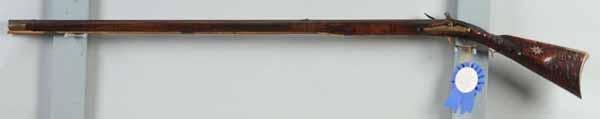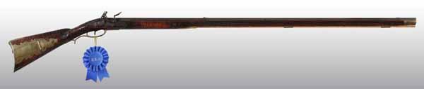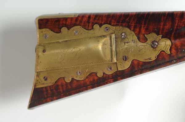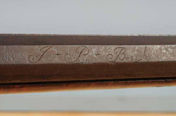 Description Circa 1785 to 1795. OL: 60 - 1/2”. BL: 45 - 3/4”. TB: Octagonal. LM: Flintlock. Obvious re-conversion. PB: 4-piece. S: Curly Maple. SR: Lengthened and two patched areas. Relief and incise carvings. Two silver inlays. This handsome Kentucky rifle is by one of the most desirable Pennsylvania gunsmiths. It is signed in script “J.P. Beck” (John Phillip Beck) who worked in the Cornwall area of Northern Lancaster County. J.P. Beck’s rifles have always been rated on the highest levels by collectors and dealers alike. This admiration is amplified by the quality of his 18th century workmanship in wood as well as in metal. While he signed most of his rifles, any that are unsigned are easily attributable because of his consistency of style in architecture, carving, and metal work. Apparently he cast most of his own brass as his hardware is also a highly recognized trademark. This rifle is one which was probably made in his mid-career, sometime shortly after the American Revolution. The curly maple stock is of the finest wood with dramatic curl and the carving is as vibrant and three-dimensional. Architecturally, his stock profiles are always dramatic and pleasing to the eye. The relief carving behind the cheekpiece is beautifully done. In addition, the relief carving around both sides of the front edge of the comb are all in keeping with the masterful carving behind the cheekpiece. The tang carving has a simpler design that he often used, perhaps because of the silver thumb-piece inlay. The flintlock appears to be its original lock although it has been re-converted, and two wood pieces have been set in above the lock, (fore, and aft). The full octagonal barrel is still in its original length although the forestock has an approximate 29-inch replacement including the two upper ferrules and nose-cap. This magnificent signed “J.P. Beck” still carries its Blue Ribbon given as a prize at the 1999 Kentucky Rifle Association held at Carlisle, Pennsylvania. This prize was given as the best relief carved Kentucky. His very typical four-piece engraved patchbox has the owner’s initials engraved. This is a very fine rifle ranking closely to the upper levels of his well-known workmanship as a master gunsmith. Condition (Good).