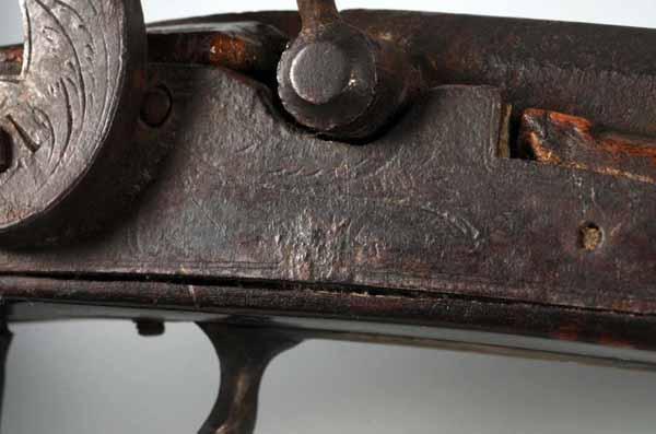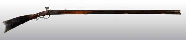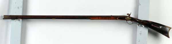 Description Circa 1840 to 1850. OL: 55 - 3/4". BL: 40 - 3/4". TB: Octagonal. LM: Percussion. Replaced. S: Curly Maple. This upper Susquehanna rifle, while quite simple, has a very fine curly maple stock which is replaced approximately three inches in front of the rear ramrod ferrule. The trigger guard and the percussion lock are not original. Condition (Fair).