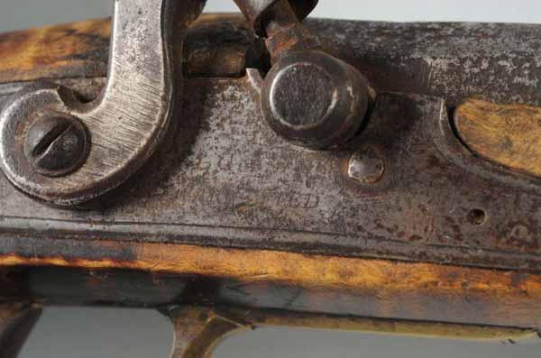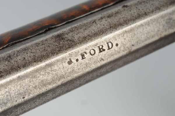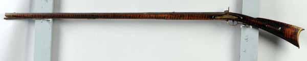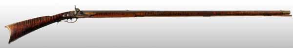 Description Circa 1820 to 1830. OL: 60 - 3/4". BL: 45". TB: Octagon to round. LM: Percussion. Original. PB: None. S: Curly Maple. This long, graceful Kentucky fowler has a very fine curly maple stick with its original finish and has no repairs or restorations. The octagonal to round barrel is signed "J. Ford" who was working in Harrisburg, PA. The lock was originally flintlock but is now in its percussion state. This is a very pleasing Kentucky fowler. Condition (Very Good).