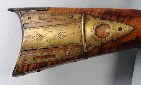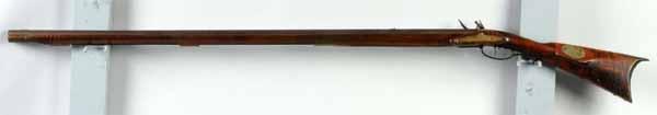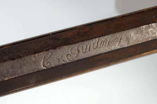 Description Circa 1830 to 1850. OL: 60". BL: 44 - 1/4". TB: Octagonal. LM: Flintlock. PB: 4-piece. S: Curly Maple. Three silver inlays. This rifle is signed "C. Fordney" and has been restored from the front of the trigger guard to the muzzle of the barrel. The splice is on a diagonal reaching up to the sides of the barrel tang. The barrel has been lengthened approximately twenty-four inches and the original percussion lock has been converted to a flint. The cheek piece inlay may be replaced. Condition (Poor).