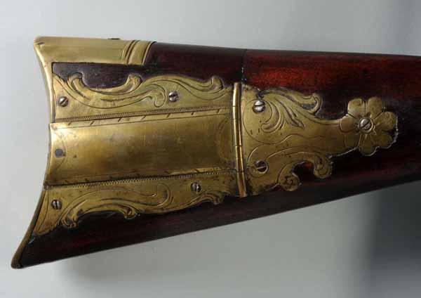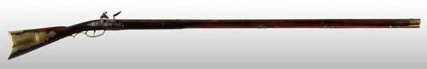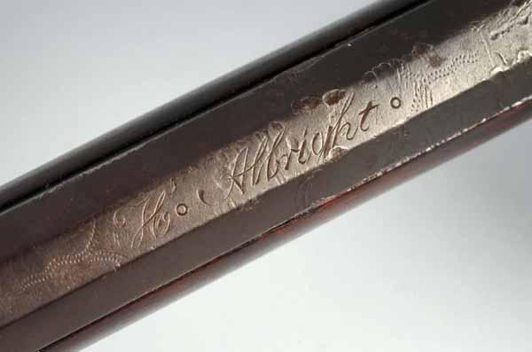 Description OL: 63 - 3/4". BL: 48 - 3/4". TB: Octagon to round. LM: Flintlock. PB: 4-piece. This Kentucky is a signed "Henry Albright" with its original octagonal to round barrel and walnut stock with a well-engraved patchbox. However, the forestock from the wrist forward is a modern replacement, as are the flintlock, sideplate, and trigger guard. Condition (Fair).
