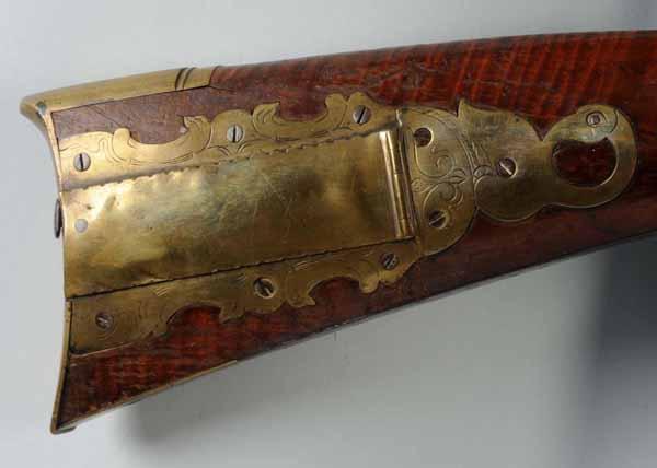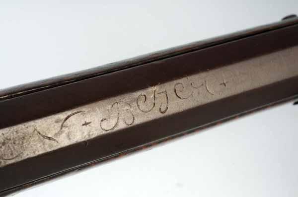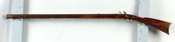 Description Circa 1830 to 1840. OL: 55 - 1/4". BL: 39 - 1/2". TB: Octagonal. LM: Flintlock. Obvious re-conversion and replaced. PB: 4-piece. S: Curly Maple. Incise carving. One silver inlay. This Kentucky rifle signed "Nicholas Beyer" is one of his slightly later rifles but has almost perfect condition with the exception of the replaced flintlock. It still retains its original varnish finish, his easily recognized "bird plucking its feathers" patchbox finial, and a simple but pleasing incised carving behind the cheekpiece. Nicholas Beyer, who was the apprentice of the master gunsmith J.P. Beck, was still working in the 18th century manner. The fine curly maple stock is highly attractive, as is the overall architecture. Condition (Very Good).