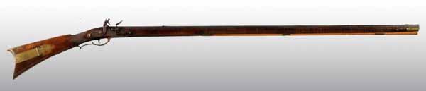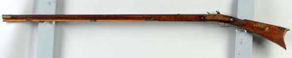 Description OL: 61". BL: 45 - 3/4". TB: Octagonal. LM: Flintlock. PB: 2-piece. S: Curly Maple. Incise carving. One silver inlay and one brass inlay. This Kentucky is easily recognized as J. Kuntz's work, although unsigned. The barrel is heavily pitted and the flintlock is a replacement, as is the sideplate. The stock has been cleaned and other miscellaneous metal parts are damaged or replaced. The patchbox and the pierced oval star inlay are well engraved. Condition (Fair).