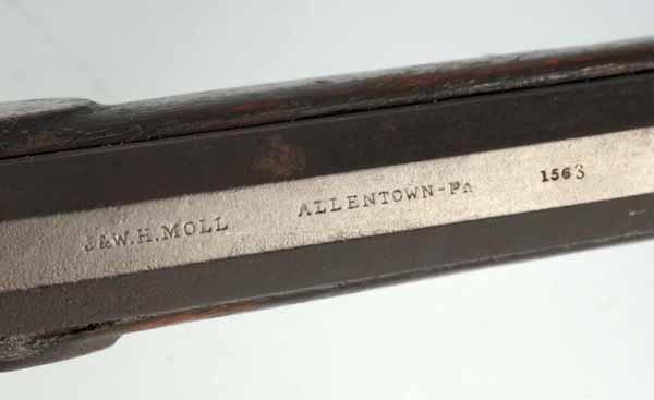 Description Circa 1840 to 1850. OL: 61 - 1/2". BL: 45". TB: Octagonal. LM: Percussion. PB: 4-piece. This later signed "J. & W. & H. Moll Allentown" Kentucky has a plain walnut stock and remains in its percussion state. There appears to be no restorations, although the surface is somewhat rough. Condition (Good).