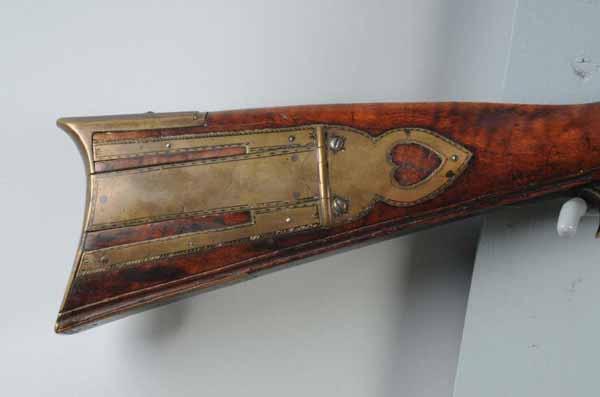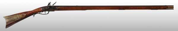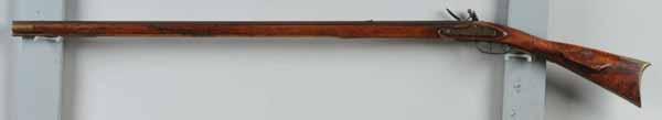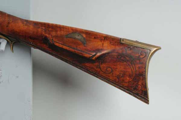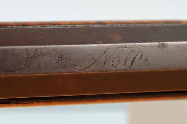 Description Circa 1820 to 1830. OL: 55 - 1/4". BL: 40". TB: Octagonal. LM: Flintlock. PB: 4-piece. SR: Wrist repair. Incise carving. 2 silver inlays. This Kentucky rifle signed in script "H. Noll" (Henry, the son of John Noll), is very pleasing with its simple incised carving and a nicely engraved patchbox with a "heart" piercing. The toe-plate and sideplate are also nicely engraved. While there is a wrist repair and the lock is re-converted, it is a very nice, average example of his work. Condition (Very Good).