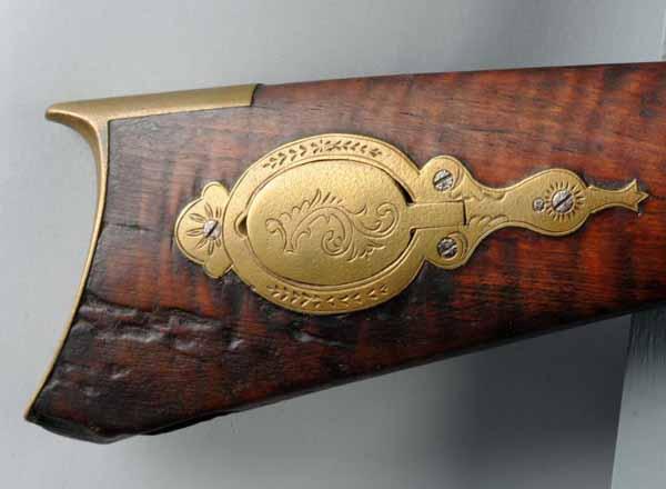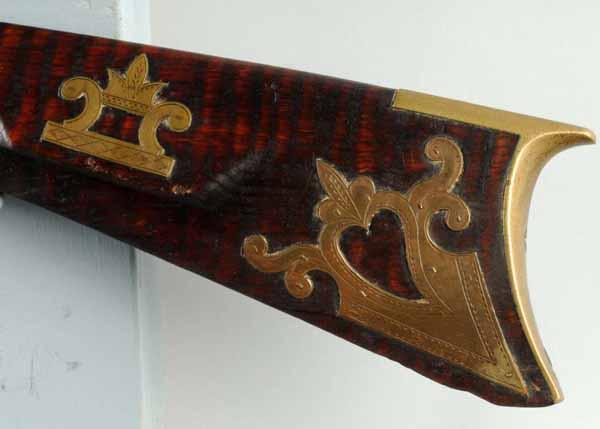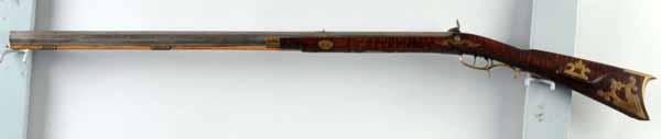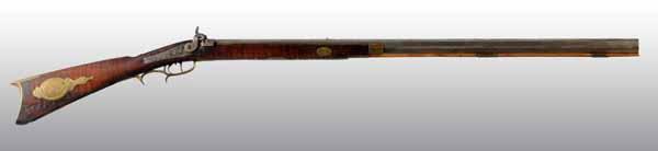 Description Circa 1840 to 1850. OL: 50". BL: 34 - 1/4". TB: Octagonal. LM: Percussion. Original. PB: Oval. S: Curly Maple. Four brass inlays. This curly maple half-stock Kentucky rifle is signed "B E" in script and has a back-action percussion lock marked "Whitmore Wolfe Duff Pittsbrugh, Pa.". There are four brass inlays, a wear plate. and an oval patchbox all very nicely engraved. The cheekpiece and rear two inlays are unique, one having a "weeping heart" as a piercing. The toe-plate, a small piece of wood and the very lower tip of the buttplate is currently missing. The barrel and the lock have light pitting and have been cleaned bright. Condition (Good).