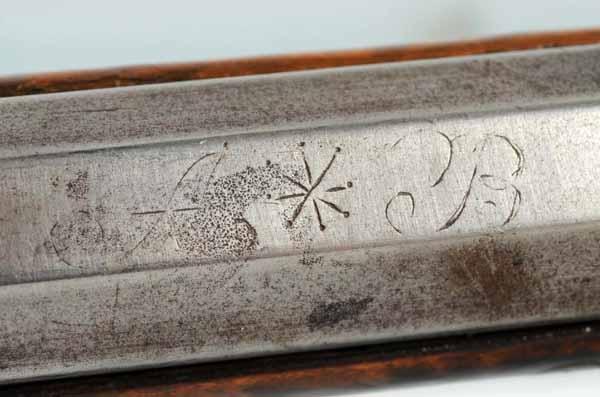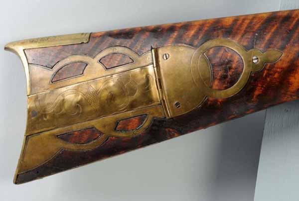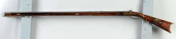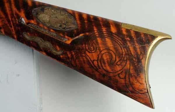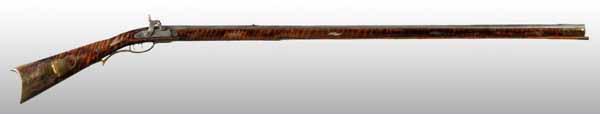 Description OL: 58 - 3/4". BL: 43 - 1/2". TB: Octagonal. LM: Percussion. PB: 4-piece. S: Curly Maple. Incise carving. 19 silver inlays. This is a late example of a Bedford County rifle with simple incised carving and 19 silver inlays, including an oval cheek piece with "spread-wing eagle". While six silver inlays are replacements, the stock has a very pleasing old finish. The barrel initials "A" and "B" may stand for Andrew Baker or "Amos and Border". Condition (Very Good).