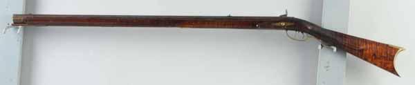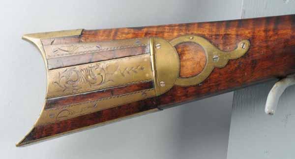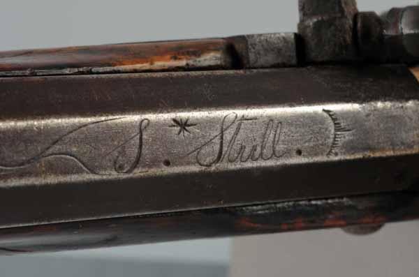 Description Circa 1830 to 1840. OL: 50 - 3/4". BL: 35". TB: Octagonal. LM: Percussion. PB: 4-piece. S: Curly Maple. SR: Lengthened and wrist repair. This Kentucky rifle is signed in script "S. Stull" and has nice engraving on the original percussion lock, four-piece patchbox, and long toe-plate. The forestock has 21 inches very well-spliced from the rear ramrod pipe and there is a wrist repair which has been darkened. Condition (Fair).