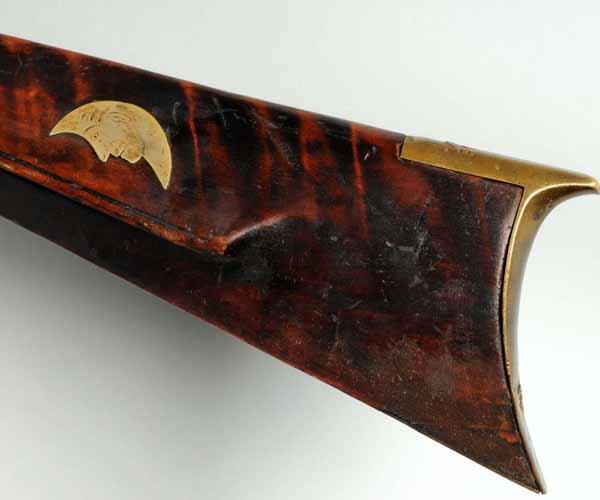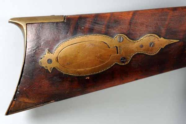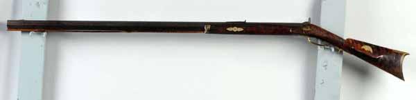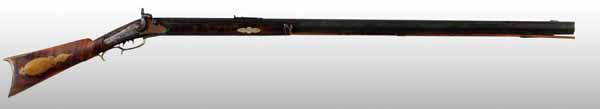 Description OL: 56 - 3/4". BL: 42". TB: Octagonal. LM: Percussion. PB: Oval. Three silver inlays. This is a typical late period Kentucky half-stock with an oval patchbox and back-action lock. There is stamped illegible name on top of the barrel and the barrel tang has been lengthened back to the comb of the buttstock. Condition (Fair).