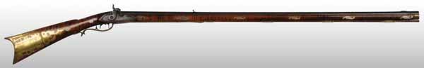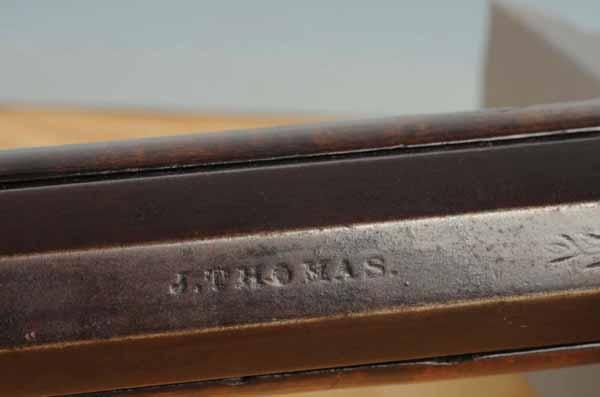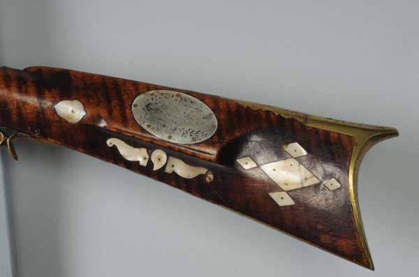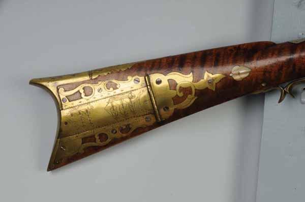 Description OL: 51 - 3/4". BL: 43 - 3/4". TB: Octagonal. LM: Percussion. PB: 4-piece. S: Curly Maple. SR: Patched at top of lock. 15 mother of pearl inlays and 15 silver inlays. This rifle, signed "J. Thomas", has an especially ornate pierced patch box with nice, original surface. The cheek piece inlay is a classic "spread-winged eagle" inlay. This gunsmith was an excellent engraver and engraved two three-mast ships on the patch box lid. One is at full sail, the other is at anchor. This is a very unique motif on a Kentucky Rifle and may indicate its origin of being close to one of the Great Lakes. Condition (Very Good).