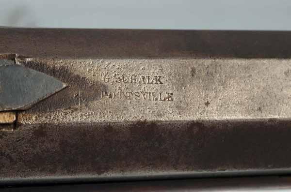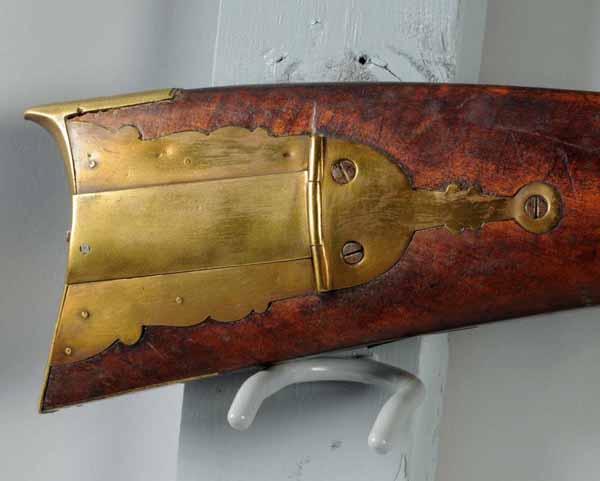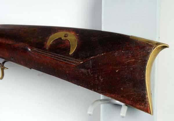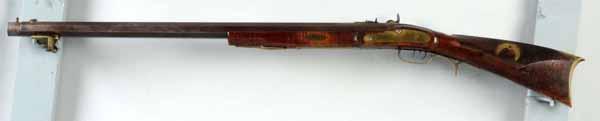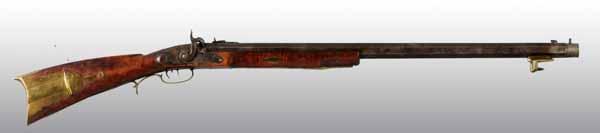 Description Circa 1835 to 1850. OL: 47 - 1/4". BL: 31 - 1/2". TB: Octagonal. LM: Percussion. PB: 4-piece. S: Curly Maple. Incise carving. Four silver inlays. This late Kentucky bench rifle was probably shortened in its later years and a false muzzle was added. The earlier, recycled patchbox belies its time of manufacture. Condition (Fair).