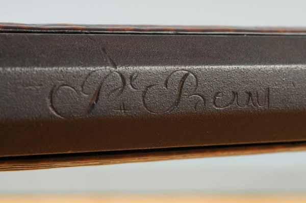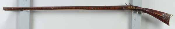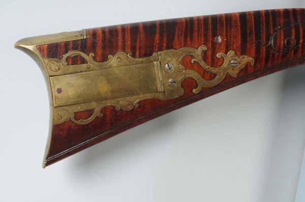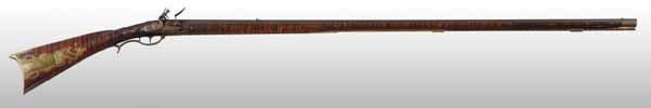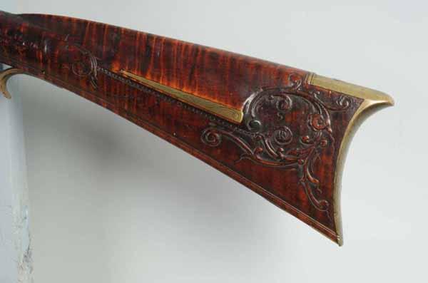 Description Circa 1810 to 1820. OL: 64”. BL: 48”. TB: Octagon to round. LM: Flintlock. Obvious re-conversion. PB: 4-piece. SR: lengthened 12 inches, patched two inches, and wrist repair. Relief and incise carvings. One brass inlay. This rifle, signed “P. Berry” is an excellent example of his premier workmanship which he apparently continued until 1836, the year of his death. The relief carving behind the cheek piece is quite exceptional in its rococo design and shows the very fine delicacy of his hand. All of the other carvings, especially behind the tang, are extremely well-done and also quite pleasing aesthetically. His forestock moldings are a distinctive feature as well as his brass metal mountings in particulars, his patchbox design, with its graceful, flowing outline, is very distinctive and quickly recognizable as are his scalloped sideplate and even the trigger guard, the classic hallmarks of his work. The curly maple stock is of the very best quality as well. There is a mend at the broken wrist as well as the rear “beaver-tails”, on both sides, being restored. The flintlock, a re-conversion, appears to be the original lock, although it has been cleaned. The upper 12 inches of the forestock and barrel have been added, increasing the length of the rifle to its original dimensions. Accordingly the barrel has been re-browned. This rifle is an exceptionally good example of Peter Berry’s work, and the repairs could be improved (surface wise) to make this an even better example of this very desirable maker’s work. Condition (Good).