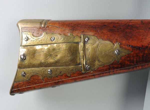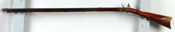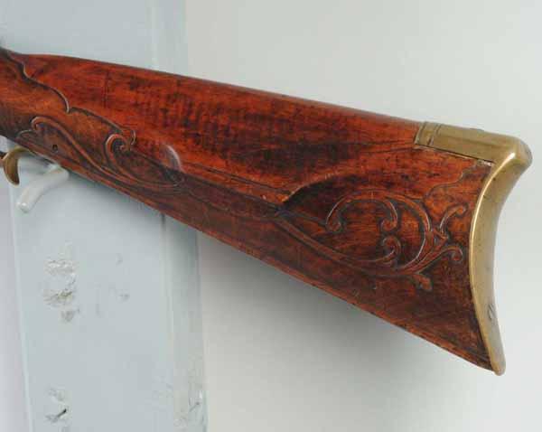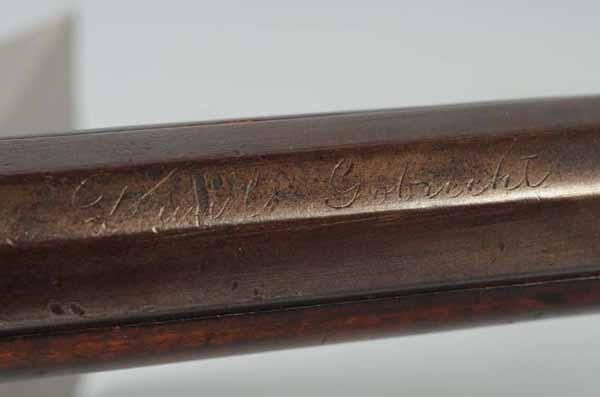 Description Circa 1820 to 1830. OL: 57". BL: 41 - 3/4". TB: Octagonal. LM: Flintlock. PB: 4-piece. S: Plain Maple. Relief carving. This rife is signed "D. Gobrecht" and has been embellished by adding relief carving to the butt stock and the lock is a replacement. Both of these additions are modern work; however the rifle is an example of a scarce maker. Condition (Fair).