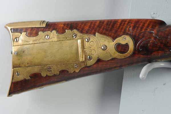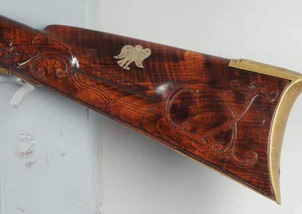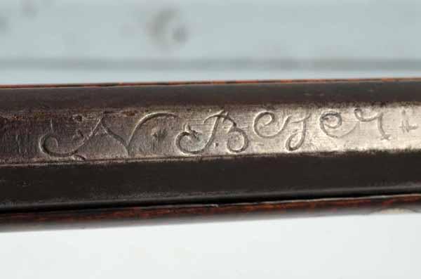 Description OL: 57 - 3/4". BL: 42 - 1/2". TB: Octagonal. LM: Flintlock. PB: 4-piece. S: Curly Maple. SR: Patched. Relief and incise carvings. Six silver inlays. Unfortunately, this signed "Nicholas Beyer" has been embellished by adding relief carving and German silver inlays. This is modern work, not of the period. In addition, there are long patches on the forestock. Condition (Fair).