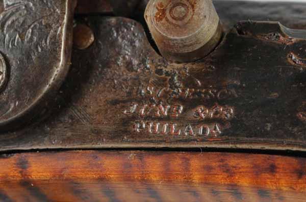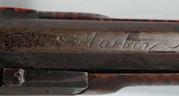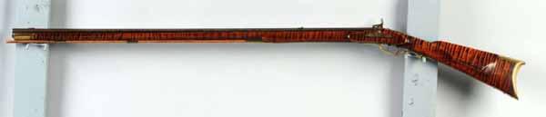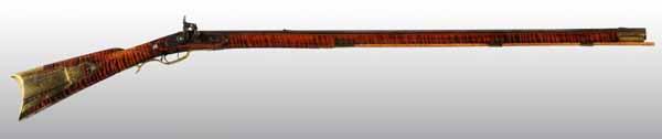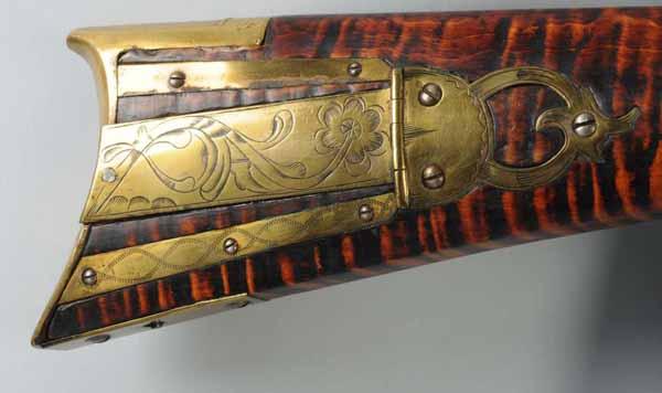 Description OL: 55 - 1/4". BL: 39". TB: Octagonal. LM: Percussion. Original. PB: 4-piece. S: Curly Maple. SR: Wrist repair. This rifle is signed "David Marker" and is an example of a rifle being re-stocked in a later period of use, as the barrel was shortened and new sideplate was made. However, the patch box engraving is quite dramatic, as is the very fine curly maple stock. Condition (Good).