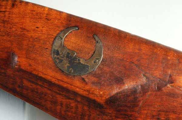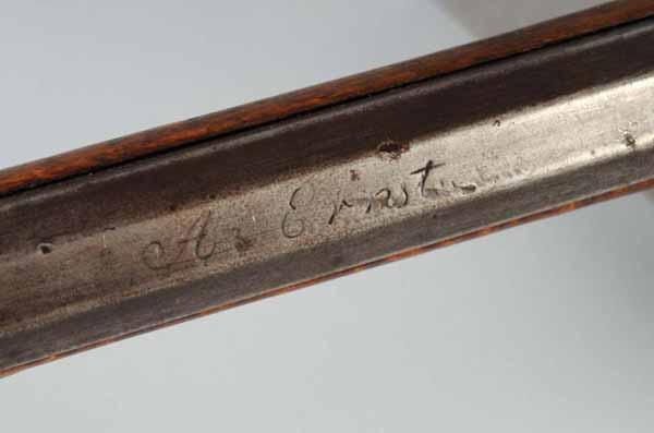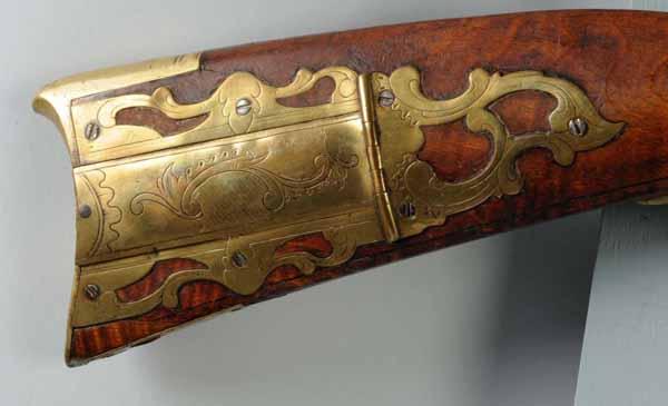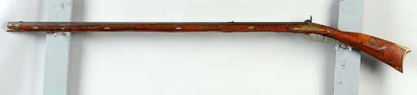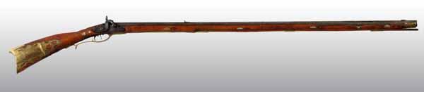 Description Circa 1830 to 1845. OL: 58 - 1/4". BL: 43 - 1/2". TB: Octagonal. LM: Percussion. PB: 4-piece. S: Curly Maple. 12 silver inlays. This Kentucky is another example of an upper Susquehanna "in-period re-stock" using a beautiful Adam Ernst patchbox, sideplate, silver "quarter moon" cheek inlay and his miscellaneous other brass parts along with his original "A. Ernst" signed barrel. The stock's architecture, wear plate, and half-circle inlays are very typical of the upper Susquehanna school, which is quite different from the York County style of Kentucky rifle-making. Condition (Good).