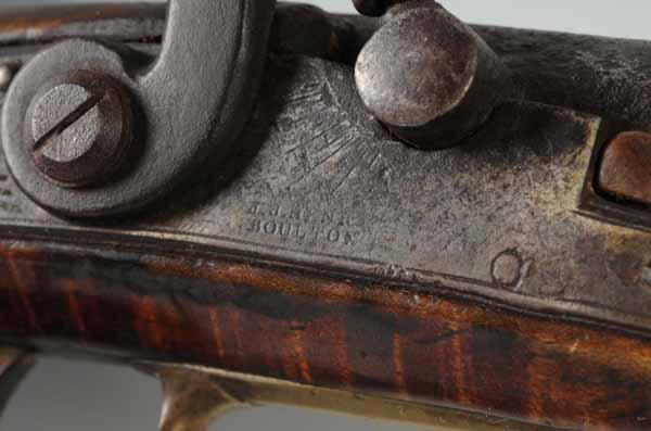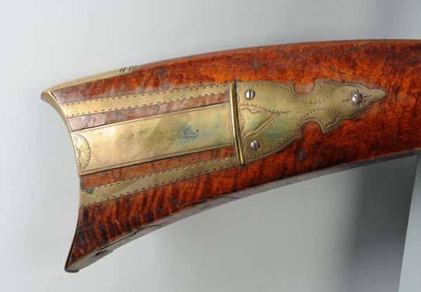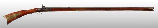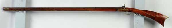 Description Circa 1820 to 1830. OL: 58 - 1/4". BL: 42 - 3/4". TB: Octagonal. LM: Percussion. Original. PB: 4-piece. S: Curly Maple. This Kentucky is a late, unsigned example of the rifles made somewhere South or East of Reading, possibly having its original varnish finish on a good curly maple stock. It originally was made as a flintlock but is now in percussion. There are two long quarter-inch silvers or wood added to both sides of the forestock preceding the nosecap. Condition (Good).