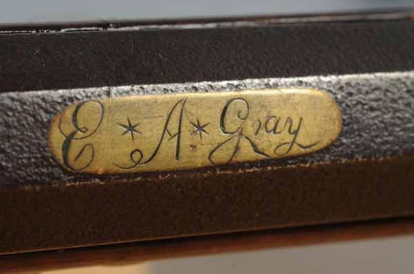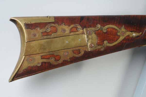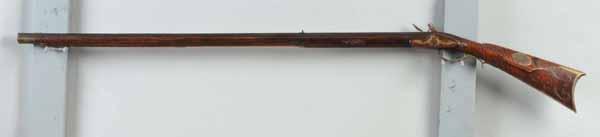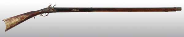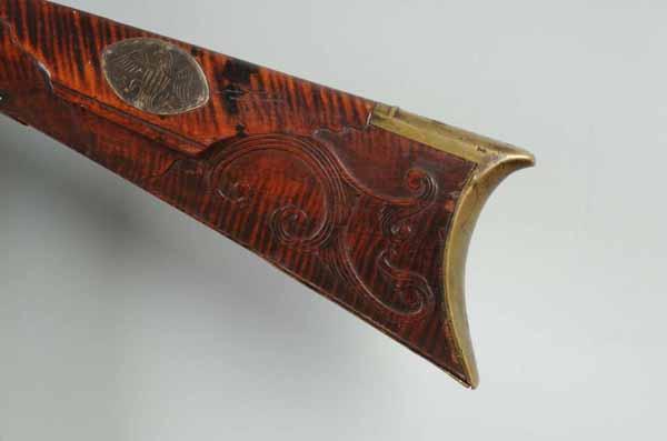 Description Circa 1840 to 1850. OL: 58 - 1/4". BL: 42 - 3/4". TB: Octagonal. LM: Flintlock. PB: 4-piece. S: Curly Maple. Relief carving. Six silver inlays. The engraved brass plate "EA Gray" on the top of the barrel is correct as is the beautiful, crisp relief carving surrounding the cheekpiece. However, the forestock starting from behind the rear ferrule is replaced, with patches back near the trigger guard. The silver oval eagle inlay on the cheekpiece is replaced as is the patchbox lid. The lock was originally made as a percussion but has now been converted to flintlock. There are several original silver acorn inlays, along with a beautifully pieced patchbox. Condition (Fair).