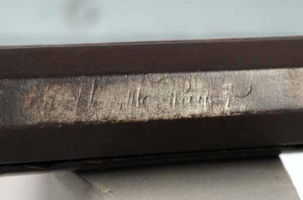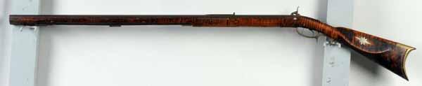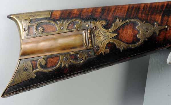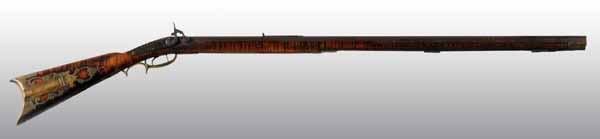 Description Circa 1840 to 1850. OL: 54 - 3/4". BL: 38 - 1/2". TB: Octagonal. LM: Percussion. Original. PB: 4-piece. S: Curly Maple. Incise carving. Two silver inlays. This Kentucky has a signed script "John Painter" on the barrel, which might place it in Southern Virginia near the Green Briar region. The patchbox is attractively pierced and engraved, as is the long toe-plate with its pierced hearts and acorns. This rifle, other than the patchbox lids, is in original, untouched, as found condition with missing silvers along both sides of the forestock. Condition (Good).