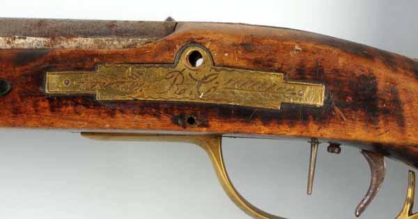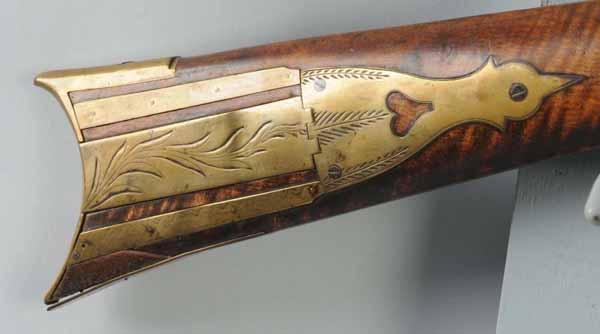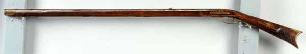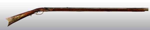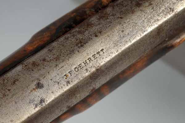Description Circa 1860 to 1870. OL: 53 - 1/4". BL: 38 - 1/2". TB: Octagonal. LM: Percussion. Original. PB: 4-piece. S: Curly Maple. One silver inlay. This rifle is a late, but typical, plain "J.F. Gehrett" signed percussion rifle missing its lock and cheekpiece silver star inlay from the Huntington County school of gunsmiths. Condition (Fair).