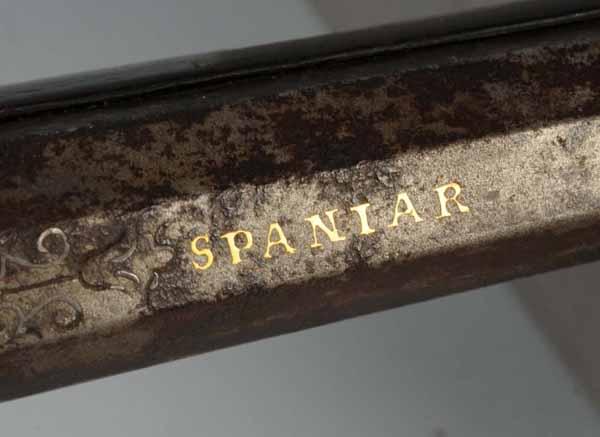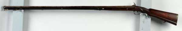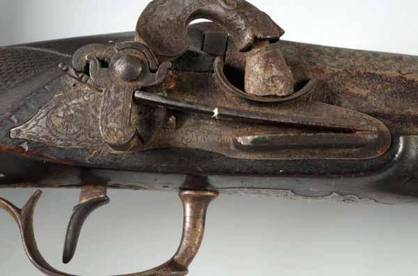 Description OL: 57 - 1/2". BL: 43". TB: Octagon to round. LM: Percussion. PB: None. Incise carving. A foreign, probably Mediterranean, fowling piece with unique percussion lock, barrel marked in gold "Spanier". The forestock is restored from the junction of the octagonal to round barrel. Condition (Fair).