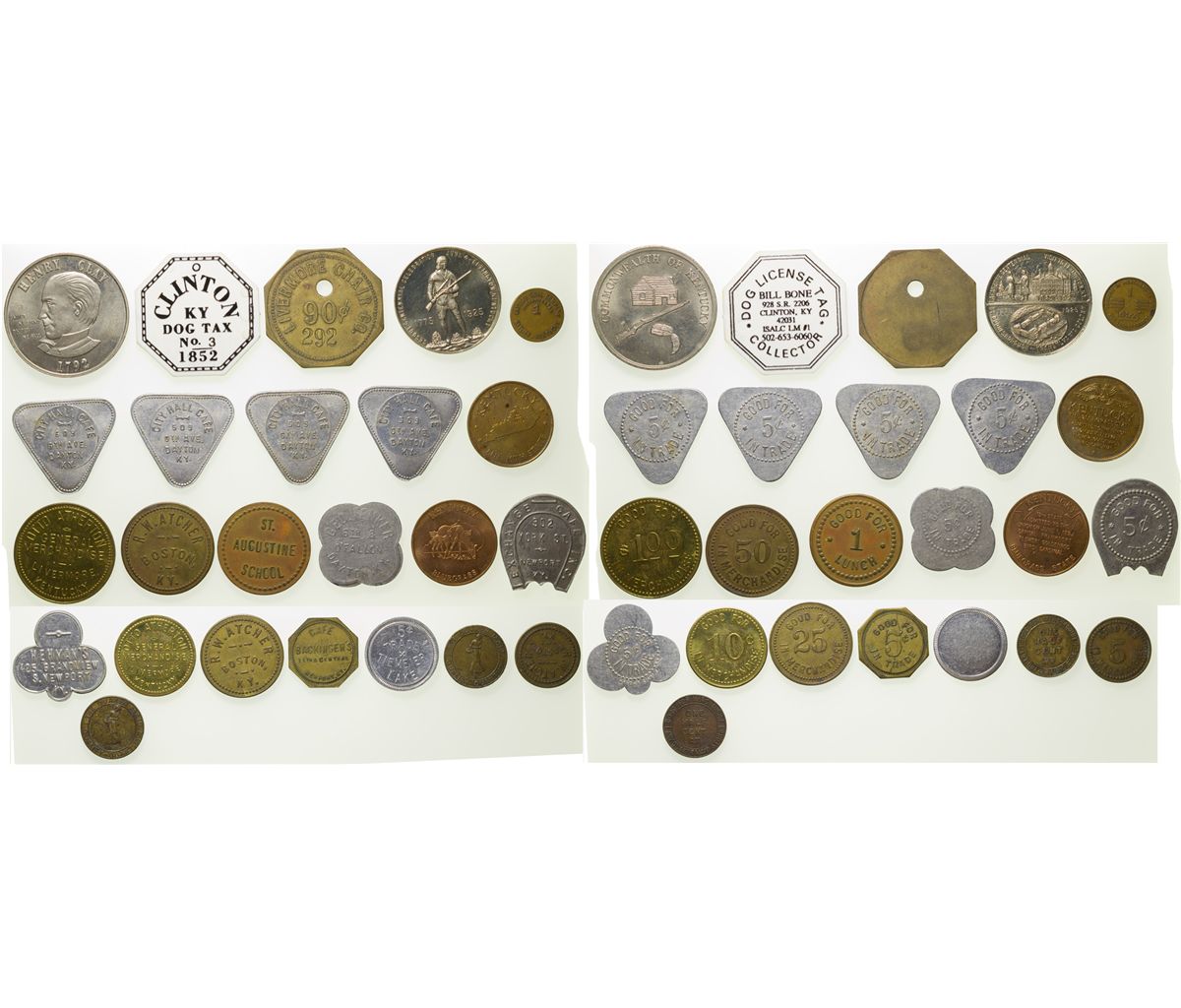 Lot of 24. Includes 6 café tokens, like the City Hall café. GF 5c IT. 6 General Merchandise tokens. 1 GF lunch from the Augustine School. 2 Kentucky souvenir tokens and many others. -60920