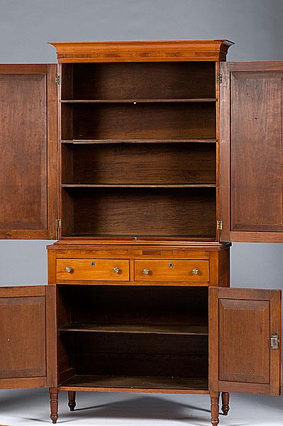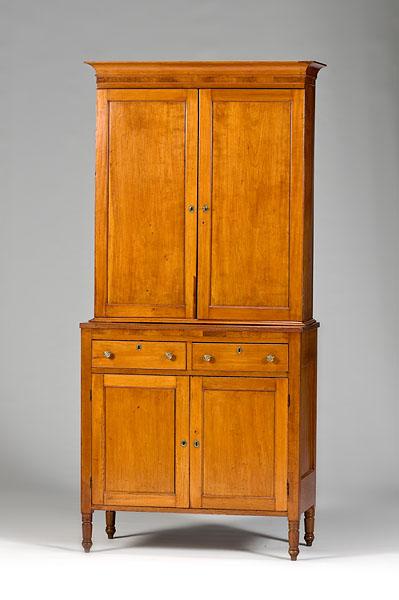 Kentucky, ca 1820-1830, with poplar seconday. The top with cove-molded cornice over two blind paneled doors rests on lower (associated) side-paneled case of two drawers over two paneled doors, rising on turned feet; 89.5" high x 41" wide x 20" deep.
