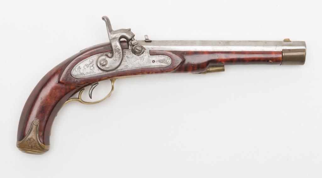 Kentucky pistol with 19th and early 20th Century parts; appears handmade with authentic American styling and motifs. Est.: $350-$700.