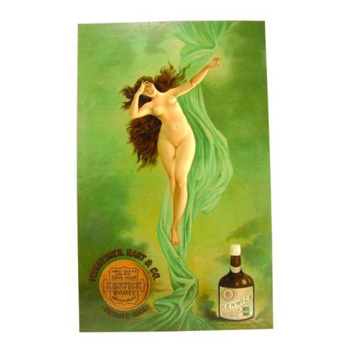 Kenwick Whiskey, Petersburg, KY. Paper Sign, Fechheimer, Hart and Co., Detroit, MI. A fabulous Nude image with long flowing hair. One of the best Nudes we have seen. Framed Under Glass, A few spots touched up in the background otherwise, Excellent Condition. Image is 16 1/2 x 26 1/2 inches.
