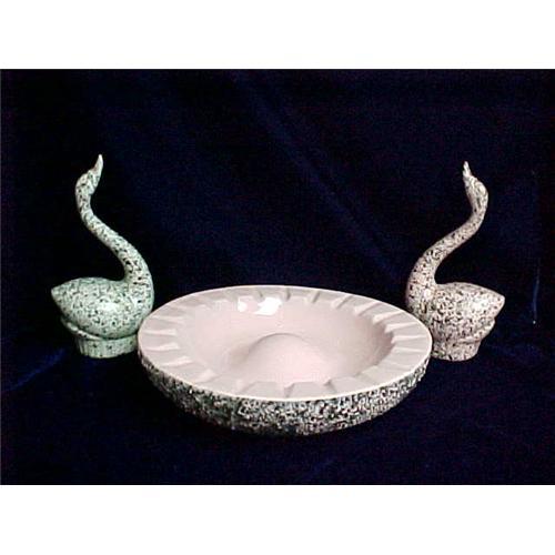 This 3 piece Art Deco ashtray and goose figurine set is in excellent condition. Sixty years later, this pink, blue and black pottery is still making a strong statement.