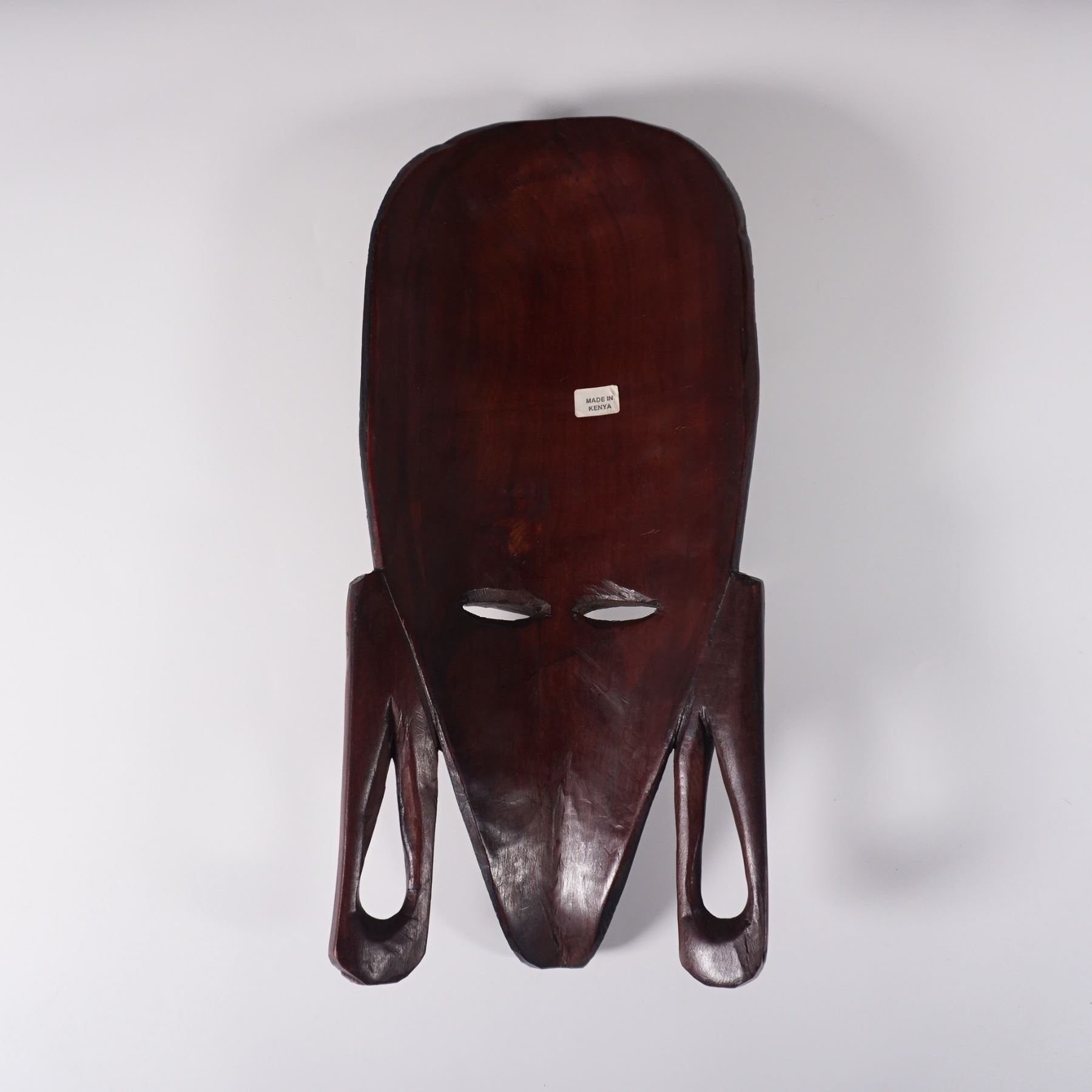 A striking hand-carved wooden mask from Kenya, showcasing traditional African craftsmanship. The mask features intricate detailing with incised geometric patterns and a deep brown finish accentuated by black and earthy tones. The elongated facial structure and stylized facial features lend a tribal aesthetic, emphasizing cultural artistry. The reverse side retains a "Made in Kenya" sticker, confirming its origin.