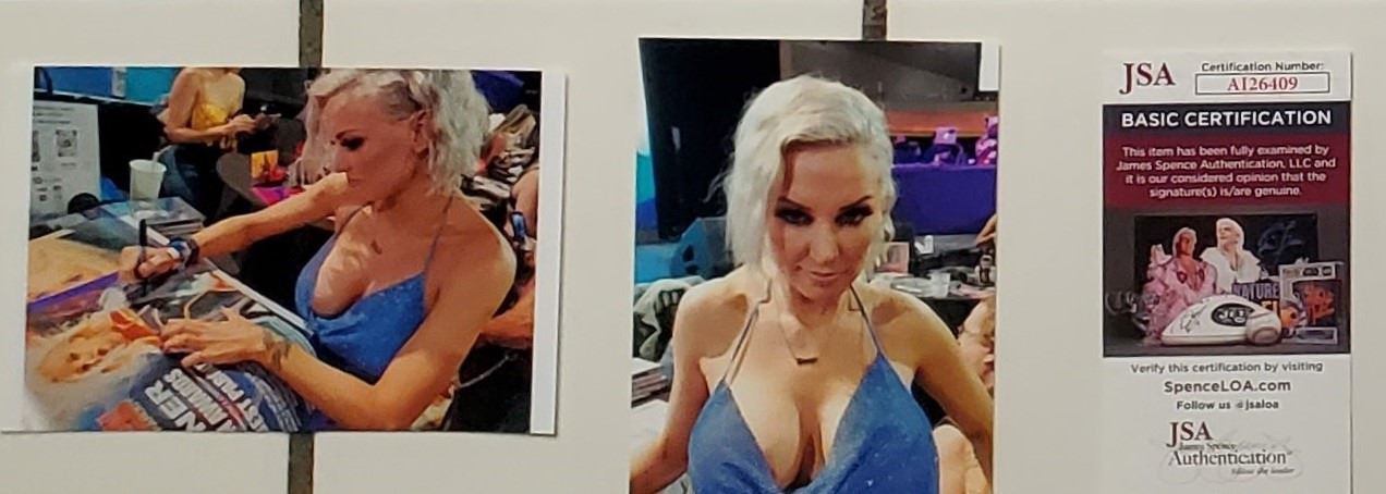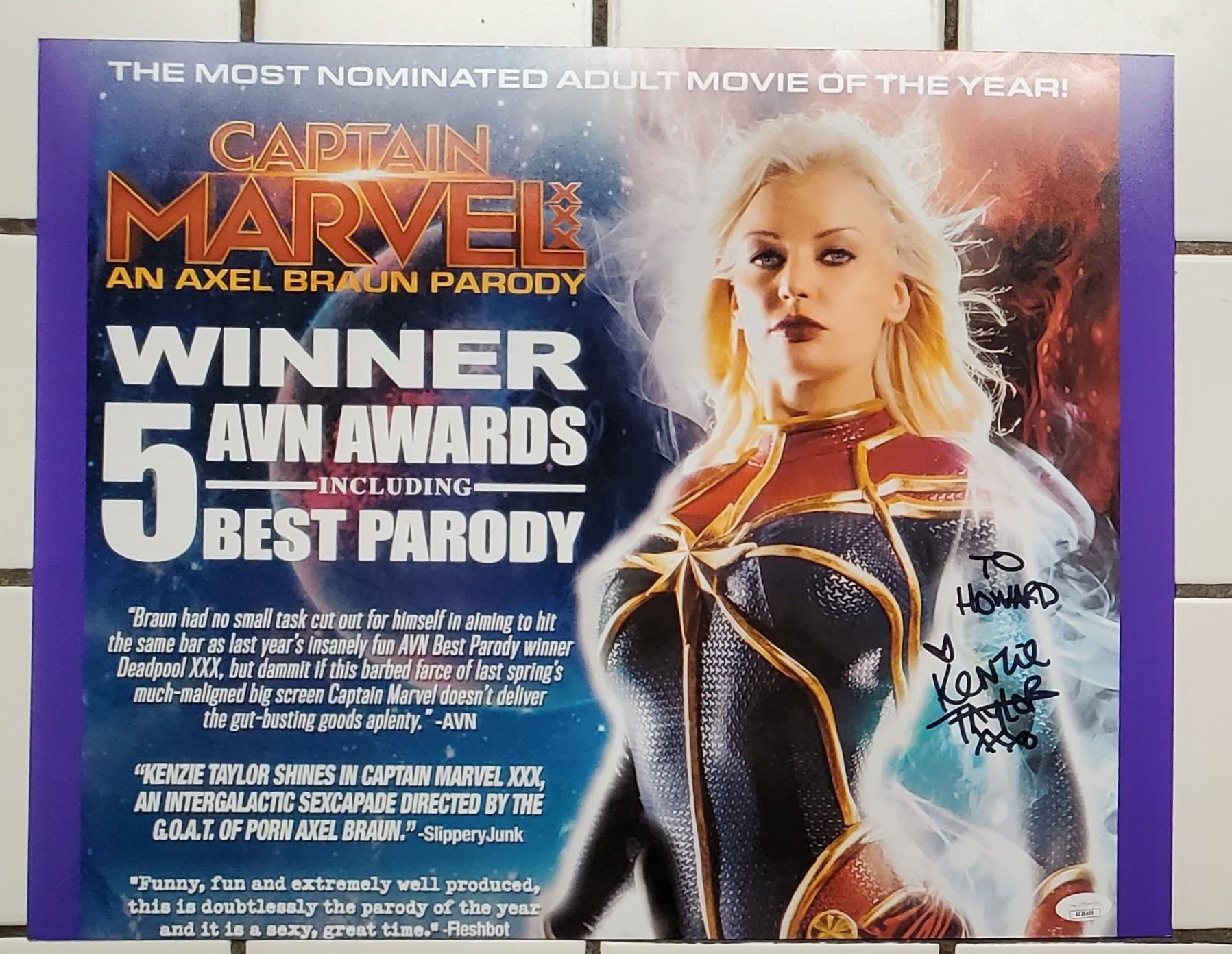 I personally obtained Kenzie Taylor’s autograph. A photo of her signing the piece is included. JSA also authenticated the autograph.