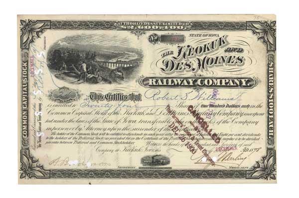 1878, Iowa. Stock certificate for 100 shares. Black. Vignette of panoramic view or workers and train.