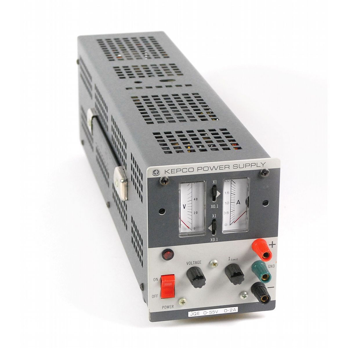 Unused Kepco Model JQE 55-2 (M) power supply, serial No. H72276. Designed for 0-55 volts and 0-2 amps, this compact power supply unit measures 4.25 x 5.25 x 17 and comes with its original instruction manual and shipping box. Made for non-flight application. In very fine condition.