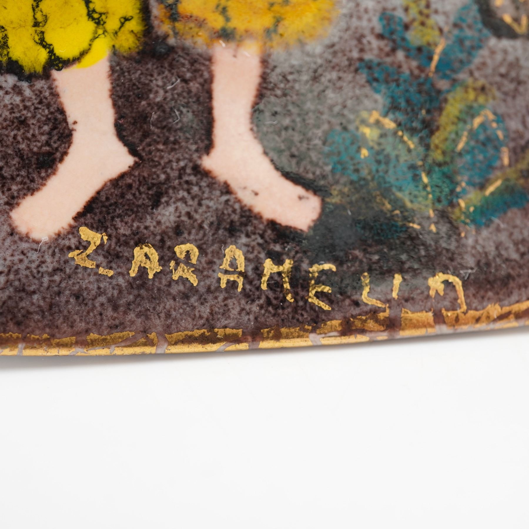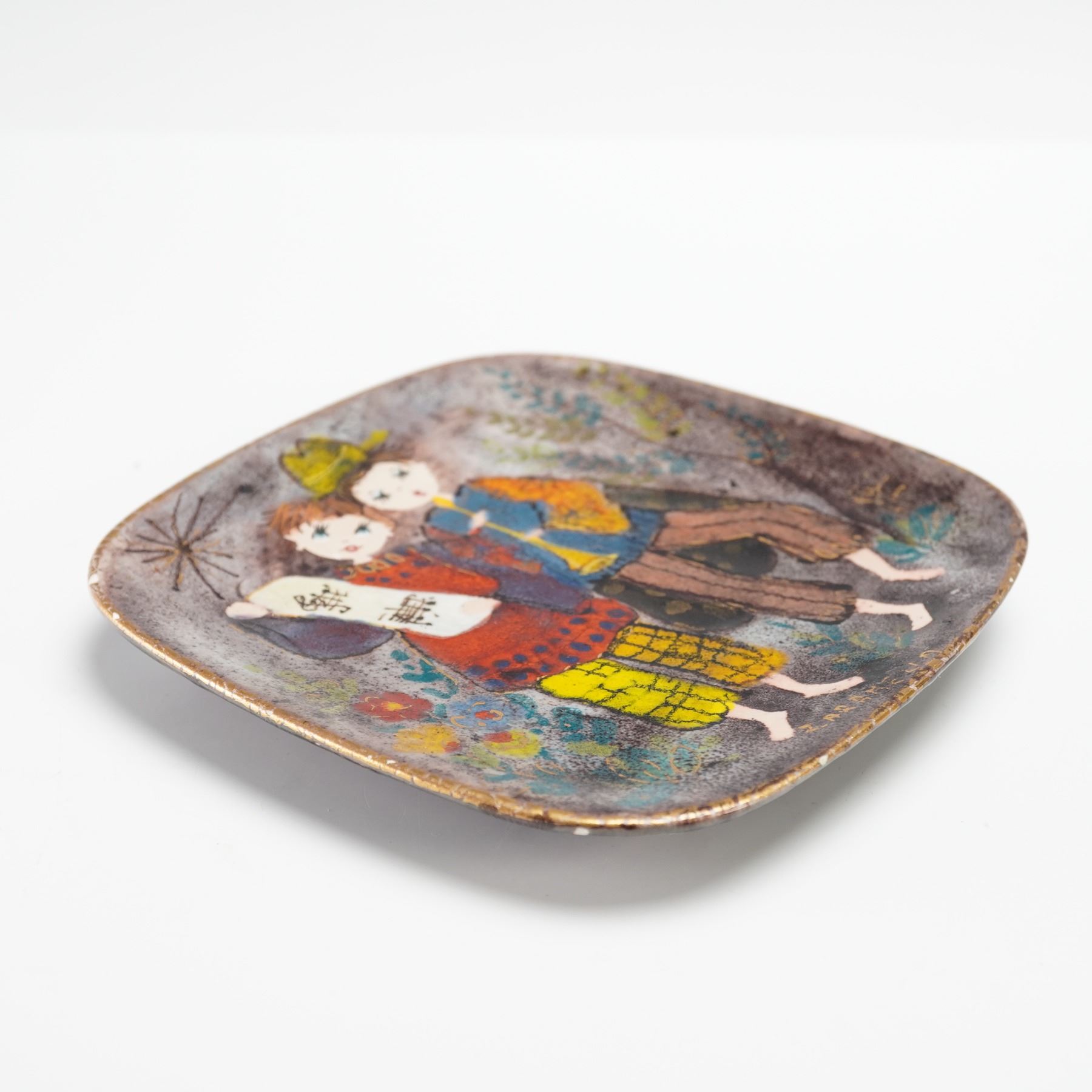 This hand painted wall hanging plate from Ker Vitrex features two charming children, one holding a music sheet, in vibrant, detailed attire. The plate is square in shape with a colorful floral backdrop and bears the artist's signature Zaramella near the bottom. It is marked with the Ker Vitrex brand and Saks Fifth Avenue label, indicating it was made in Italy. The gold-trimmed edges enhance the lively, whimsical scene, making it a perfect decorative piece for any wall.