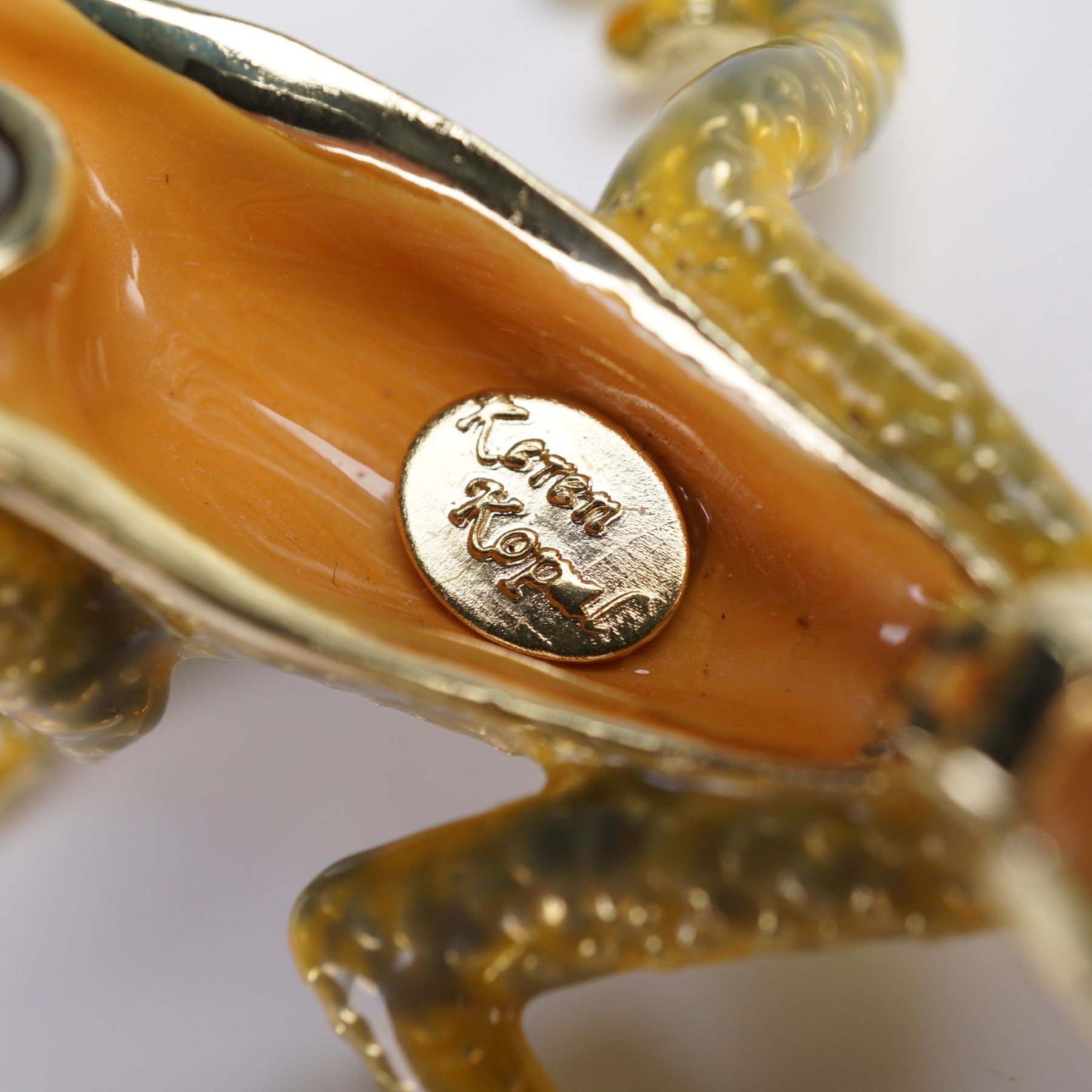 Decorative enameled treasure box by Keren Kopal in the form of a lizard. Features gold-tone accents, jeweled details, and a hinged opening with magnetic clasp. The interior bears the Keren Kopal plaque.