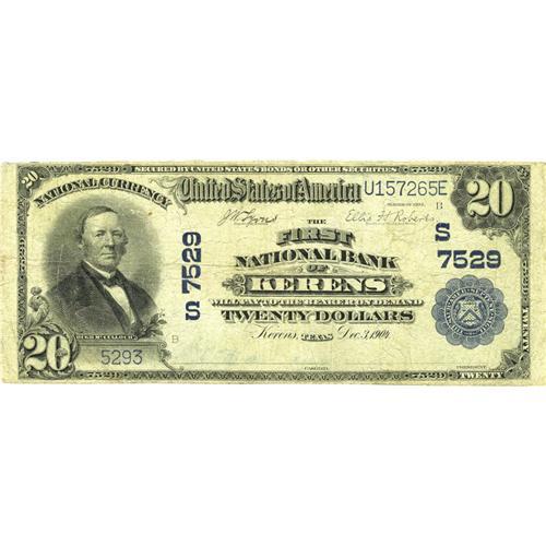 <B>Kerens, TX</B></I> - $20 1902 Plain Back Fr. 650 <B>The First NB</B></I> Ch. # (S)7529<BR>A tougher Navarro County bank with just five large (and even fewer small) notes in the census. <B>Very Good-Fine.</B></I>