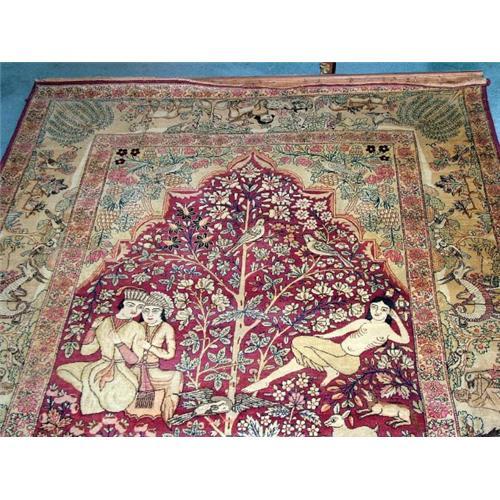 Kerman Lavar Persian Rug, measuring 92i x 55i, Tree of life , over 500 knots per inch (This is quality !!), it has been hanging on a wall, just minor guard border missing at bottom, otherwise in very good condition ,but please request detailed quality pictures, Wool on cotton warp,extremely nice rug with human and both real and mythic animals portraits and depictions of historical events.