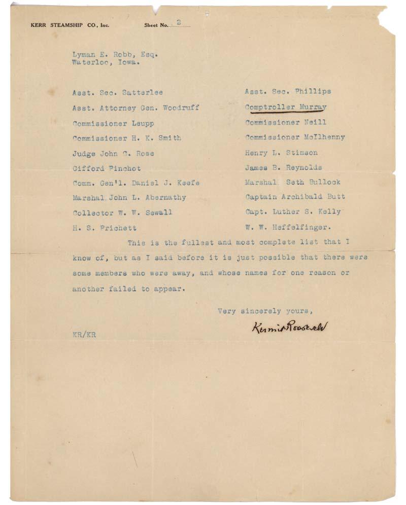 KERMIT ROOSEVELT (1889-1943). Roosevelt, the son of Theodore, was a businessman and served in both World Wars.. Typed Letter Signed, one page, 8.5 x 11, Kerr Steamship letterhead, no date. Second page of a letter, which includes a list of names “the fullest and most complete list that I know of…” sent to Lyman Robb, including such names as Gifford Pinchot and Secretary of War Henry L. Stimson. Signed in black ink by Roosevelt. In very good condition, with light toning, minor haloing to signature, some light creasing and a bit of edge wear.