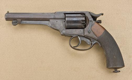 Kerr DA percussion revolver, .44 cal., 5-3/4” octagon barrel, blue finish, checkered wood grips, #8555 with J.S. and anchor proof. This gun is in overall very good condition showing approx. 15% original blue with thebalance gone to a pleasing brown patina, overall good bore, action is rotating the cylinder but not cocking the hammer; good markings and very good grips; original lanyard ring retained and British proof marks on upper left barrel flat by the breech. In desirable serial # range that may have gone to the confederacy. Est.: $3,500-$7,000.