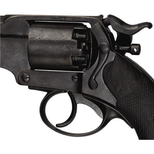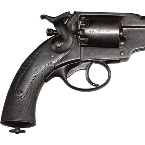 <B>Kerr London Revolver Marked "JS" over Anchor,</B></I> .44 caliber, five shot cylinder, serial number 2439. The London Armoury Company, manufacturer of the Kerr Revolver, produced at least 7,000 revolvers for the Confederacy, making it the most prolific revolver supplier to the Southern Cause. This particular piece exhibits some early production features such as a pinned loading lever lock and the single pin behind the hammer on the back-action sidelock. The frame is engraved, "KERR'S PATENT" with the serial number on the right side above the trigger guard and is also stamped "LONDON / ARMOURY" on the left side. The serial number is also engraved on the cylinder side and front. The words, "LONDON ARMOURY" are engraved on the sidelock. British proofmarks are located on the barrel and on the cylinder, between each nipple. The barrel is also marked "LAC" in front of the proofmarks. The revolver is mechanically very good exhibiting about 60% blue over most parts with some light pitting. The grips are well worn walnut with traces of varnish on the left panel flat. <BR><BR><B>Kent Wall's Report:</B></I> <BR>The London Armory Company was founded in February, 1856, and among the stockholders were Robert Adams (Adams Revolver) and James Kerr. The factory was located in London. <BR>In 1859, Adams disassociated himself and James Kerr became the leading figure in the operation. Kerr obtained several patents and began manufacturing revolvers in 1859. In late 1861, the U.S. Government purchased 16 revolvers, the only recorded sale to the U.S. <BR>The Confederate Government sent Caleb Huse to Europe to purchase arms of all types. He quickly succeeded in placing contracts with the London Armory Company and the first delivery occurred in September 1861, when the steamer <I>Bermuda</B></I> docked in Savannah, Georgia. <BR>Bill Gary in <I>Confederate Revolvers</B></I> states that some 7,000 revolvers were delivered to the Confederacy and the serial number range was more or less between 3,000 and 10,000. Further, Mr. Gary states that although the Kerr revolver was made in both .44 caliber and .36 caliber, only the .44 caliber was shipped to the Confederacy. <BR>Many of the external markings were engraved with only the "London Armoury" in small letters stamped on the left side of the frame. There is much speculation as to the significance of the "JS" over anchor found on many Kerr revolvers just below the trigger guard groove. Some collectors feel this is a hallmark of arms shipped to the Confederacy while others feel it may be the mark of "J. Smiles", a stock maker in London. <BR>One point to note when examinining Kerr revolvers- the right side of the frame is engraved "Kerr's Patent" followed by a serial number. This number is not the patent number. <BR>This .44 caliber revolver follows the standard pattern and has "Kerr's Patent" and SN "2439" engraved on the right side of the frame. The SN is also engraved on the cylinder. "___ A. C." is stamped on the left barrel flat in front of the proofmarks. "London Armoury Co." is engraved on the sidelock. "London Armoury" is stamped on the left side. Proofmarks are on the cylinder between each nipple. <BR>Condition: Good. Some light pitting. Grips exhibit wear.<BR><BR><b>Shipping:</b> Large Collectibles (<a target="_blank" href="http://www.heritageauctions.com/common/shipping.php">view shipping information</a>)