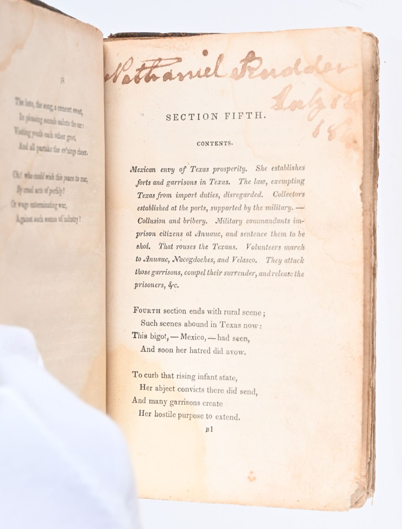 Hugh Kerr. A Poetical Description of Texas 1838. First edition, Signed by the author. A native of Ireland, Kerr arrived in America in the 1790s, eventually migrating to Texas country in 1822 and settling in Washington County. Important in Texas history as it was the first book produced in Texas. It contains mainly descriptive poems about the Battle of the Alamo, & early Texas.