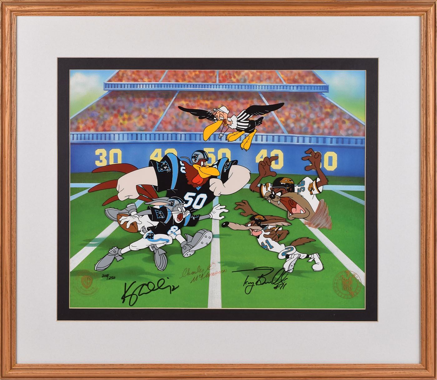 Limited edition hand-painted Warner Bros. animation cel, numbered 208/250, 16 x 13, depicting Bugs Bunny and Foghorn Leghorn in Panthers uniforms going up against Taz and Wile E. Coyote in Jaguars uniforms, signed in black felt tip by Kerry Collins and Tony Boselli. Also signed in black felt tip by the artist, Charles McKimson. Double-matted and framed to an overall size of 23.5 x 20.5. In very fine condition.