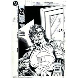 Kerry Gammill & Butch Guice - Original Cover Art to Action Comics #692 (DC, 1993). One of the most iconic images of Superman -- that of Clark Kent pulling open his shirt to reveal his "S" emblem beneath -- is beautifully rendered by artist Kerry Gammill (with terrific inks by Butch Guice). This fantastic cover is from the post-Doomsday era when Supes had returned from the dead and grown his hair long. Surely one of the greatest Superman covers of the early '90s boom, this image was used in much of DCs advertising of the day, and is very familiar to Man of Steel fans. With his taut storytelling, attention to detail, and realistic rendering, Kerry Gammill was one of the great Superman artists, enjoying a healthy run on the book from the mid-'80s through the mid-'90s. Also comes with an acetate overlay with logo attached which is not shown here. 9 1/2" x 14 1/2".  Important notice: We expect to be auctioning lots at the rate of 200-250 per hour. Sometimes eBay Premier live bid software cannot keep up with that pace, so we strongly recommend that you place a realistic proxy bid now as insurance to avoid disappointment. Also please note that all Heritage/CAA lots purchased through eBay Premier carry a 20% Buyer's Premium.