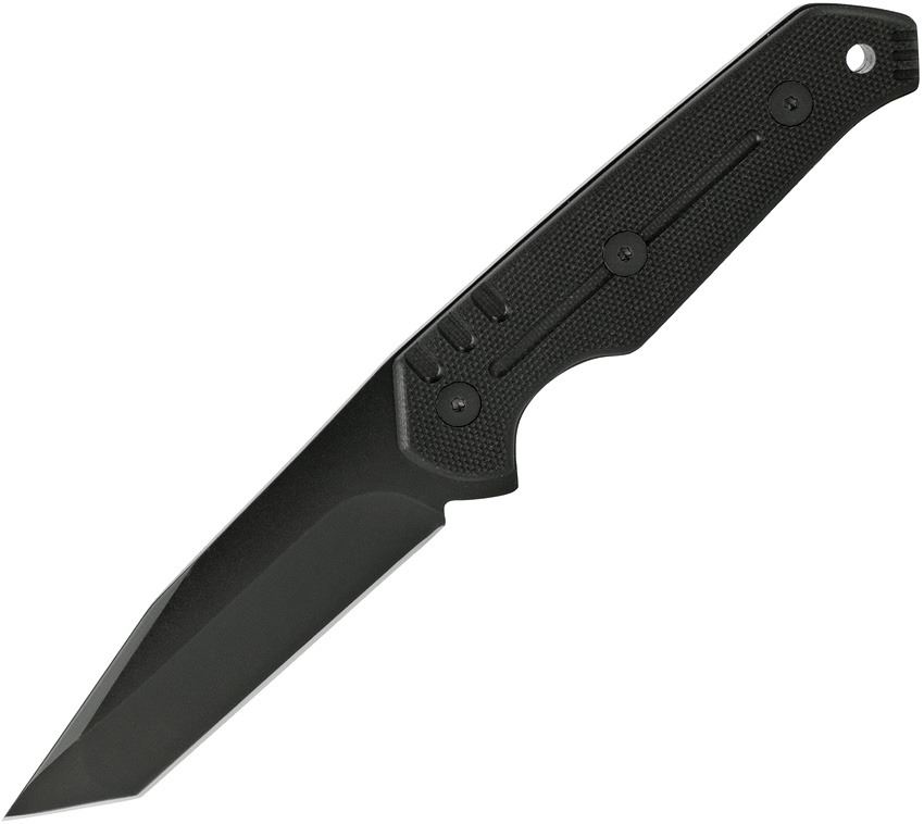 8.25" overall. 3.75" black oxide coated 8Cr13MoV stainless tanto blade. Black G10 handle. Lanyard hole. Black nylon belt sheath