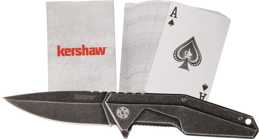 Type: Assisted Opening; Closed: 4.5"; Blade: 3.25" | 4Cr13MoV Stainless | Standard Edge; Handle: Stainless; Other Info: Lanyard Hole | Pocket Clip | Extended Tang | Thumb Ridge. Black oxide BlackWash finish blade and handles. Comes with deck of Kershaw playing cards.