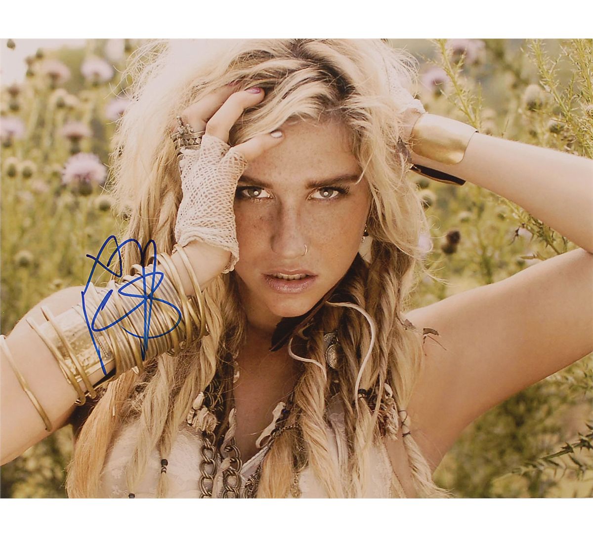 Sexy color satin-finish 14 x 11 photo of Kesha with her hands in her hair, signed in blue felt tip. In very fine condition.