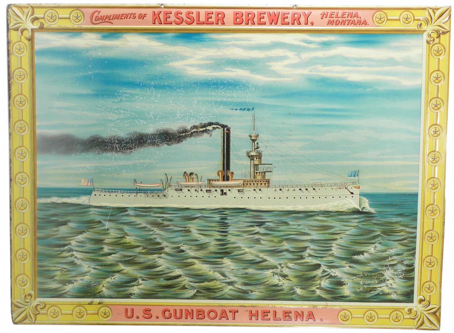 Kessler Brewery Self Framed Tin Sign. Helena, MT. Depicting U.S. Gunboat Helena. Some normal crazing throughout and slight paint loss lower left and at frame edge. Excellent condition. 23 1/4 X 17 1/4 inches.